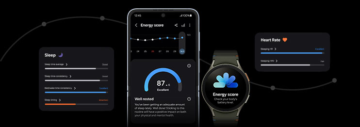 7. يتوفر مؤشر نقاط الطاقة على هواتف Android (إصدار Android 11 أو أحدث) ويتطلب تطبيق Samsung Health (الإصدار 6.27 أو الأحدث). يلزم تسجيل الدخول إلى حساب سامسونج Samsung Account. قد يختلف توفر الخدمة بحسب البلد أو المنطقة. للتحقق من مؤشر نقاط الطاقة، يجب مزامنة البيانات الصحية التي تتبعها ساعة Samsung Galaxy Watch أو خاتم Samsung Galaxy Ring مع تطبيق Samsung Health. ويحتاج على الأقل إلى بيانات النشاط وبيانات النوم وبيانات معدل ضربات القلب أثناء النوم لليوم السابق. وهو غير مخصص للاستخدام في الكشف والتشخيص والعلاج لأي حالة طبية. تستخدم النتائج كمرجع شخصي فقط. يرجى استشارة أخصائي طبي لطلب المشورة.