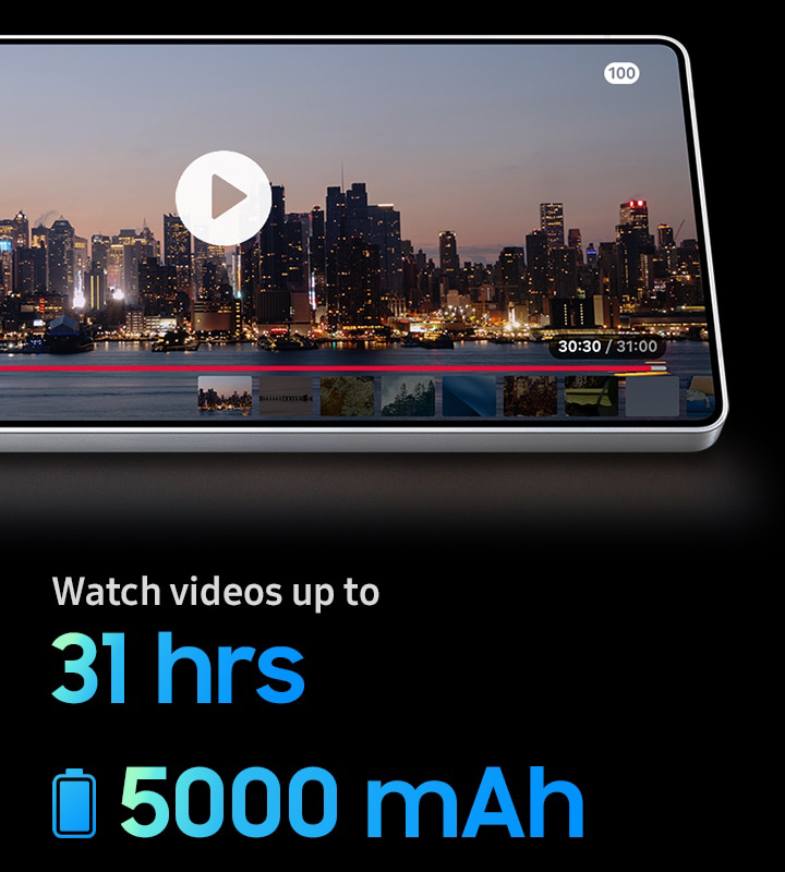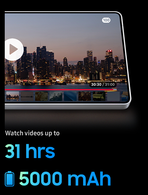*بالاستناد إلى ظروف فحص المختبر الخاص بسامسونج والمطبق على إصدار تمهيدي للطراز المتصل بسماعة عبر بلوتوث حسب الاعدادات الرئيسية لشبكة LTE. تقاس تقديرياً حسب قدرة البطارية والجهد المقاس في استهلاك البطارية خلال تشغيل الفيديو (وضوح ملف الفيديو 720 بكسل، محفوظ في الجهاز). تعتمد المدة الفعلية