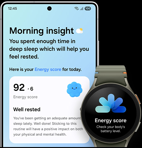 *ميزة Energy Score متاحة على هواتف Android (نظام Android 11 أو أحدث)، ويتطلب توفر تطبيق Samsung Health (إصدار 6.27 أو أحدث). يلزم تسجيل الدخول إلى حساب Samsung Account. قد يختلف توفر الخدمة بحسب البلد أو المنطقة أو اللغة. للتحقق من نقاط الطاقة Energy Score، يجب أن تكون البيانات الصحية التي يتم تتبعها عبر ساعة Galaxy Watch (ساعة Galaxy Watch4 series أو أحدث مع نظام تشغيل OS 5.0 أو احدث) أو خاتم Samsung Galaxy متزامنة مع تطبيق Samsung Health. يلزم توفر بيانات النشاط والنوم لليوم السابق، ومعدل ضربات القلب أثناء النوم. غير مصمم لكشف، تشخيص أو علاج أي حالة طبية. يرجى طلب استشارة طبية.