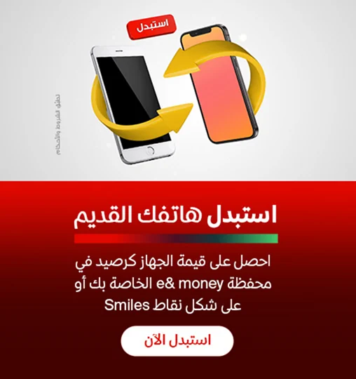 قبل استبدال جهازك، تأكد من أن لديك حساب e& money، وإن لم يكن لديك، ستحصل على قيمة الاستبدال على هيئة نقاط Smiles في رقم الحساب الذي تقدمه أثناء إجراء الاستبدال.