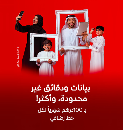 اشترك في باقة العائلة الإماراتية مقابل 1100 درهم شهرياً وأضِف لغاية 9 خطوط إضافية مقابل 100 درهم شهرياً لكل خط.