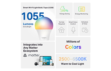 مع 1055 lumens(ما يعادل 75W) من الإضاء الواضحة وعالية الجودة، يعدTapo L535E مثالياً لأي مساحة منزلية تتطلب إضاءة أكثر سطوعاً.