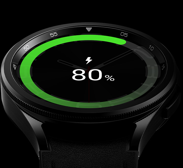 9. Testing conducted by Samsung using pre-released version of Galaxy WatchX (BT & LTE), each paired to a Samsung phone; all devices tested with prerelease software, Galaxy Watch Magnetic Fast Charging USB C Cable (EP-OR900), and Samsung 25W USB C Power Adapter (EP-TA800). Charge time varies with region, settings, usage pattern and environmental factors; actual results may vary.