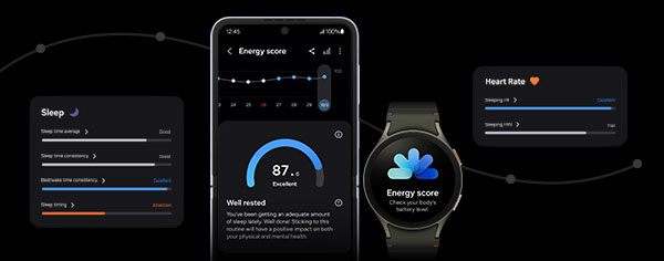 7. Energy Score is available on Android phones (Android 11 or above) and requires Samsung Health app (v6.27 or above). Samsung account log-in required. Service availability may vary by country or region. To check the Energy Score, the health data tracked from Samsung Galaxy Watch or Samsung Galaxy Ring must be synchronized with the Samsung Health App. Needs at least the previous day’s activity data and sleep, and heart rate data during sleep. Not intended for use in detection, diagnosis, treatment of any medical condition. The result is for your personal reference only. Please consult a medical professional for advice.