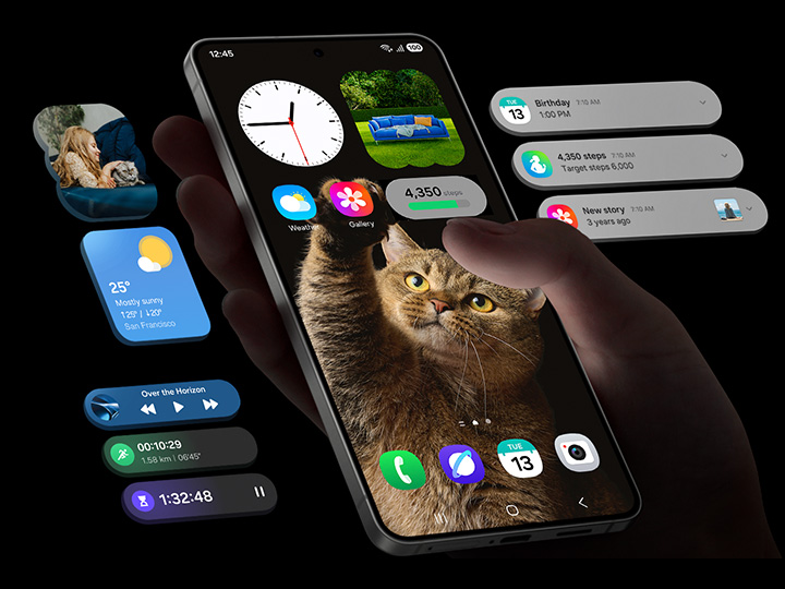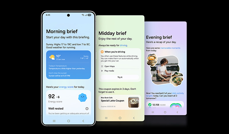 *Now Brief feature requires Samsung Account login. Service availability may vary by country, language, device model, or apps. Some features may require a network connection. To check the Energy Score, the health data tracked from Samsung Galaxy Watch or Ring must be synchronized with the Samsung Health App and the result is for your personal reference only. Events schedule notification is supported with calendar apps that utilize Android calendar database and is available if Samsung Calendar is installed. User needs to consent to access permissions such as photos, videos, audio files, and calendar events. May not display moments depending upon exposure policy. The description of photos provided by moments may not align with the user's intent.