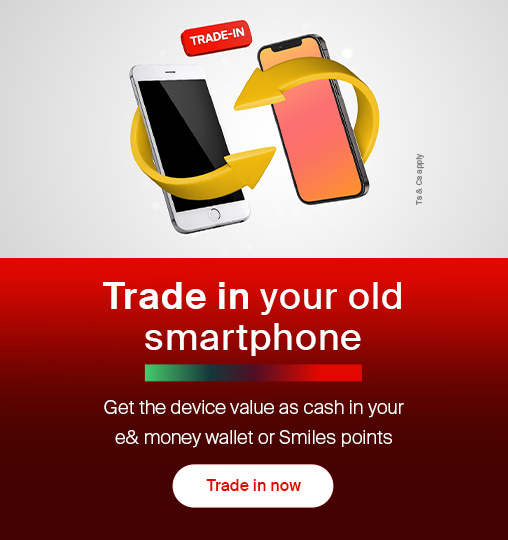 The e& Trade-in Program lets you get instant AED in your e& money wallet or Smiles Points by trading in your old device. Anyone over 18 without an active SmartPay or Business account is eligible.