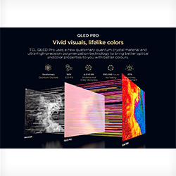 TCL QLED Pro uses quaternary quantom crystal material and ultra high precision polymerization technology to bring better optical and color properties with better colors.