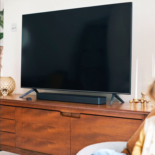 The Bose Smart Soundbar 300 uses a single connection to the TV with an optical audio cable (included) or HDMI cable (sold separately). Simply connect it to your TV, plug it into power, and turn it on. Then download the Bose Music app to connect to your Wi-Fi, choose your voice assistant, and access future software updates.